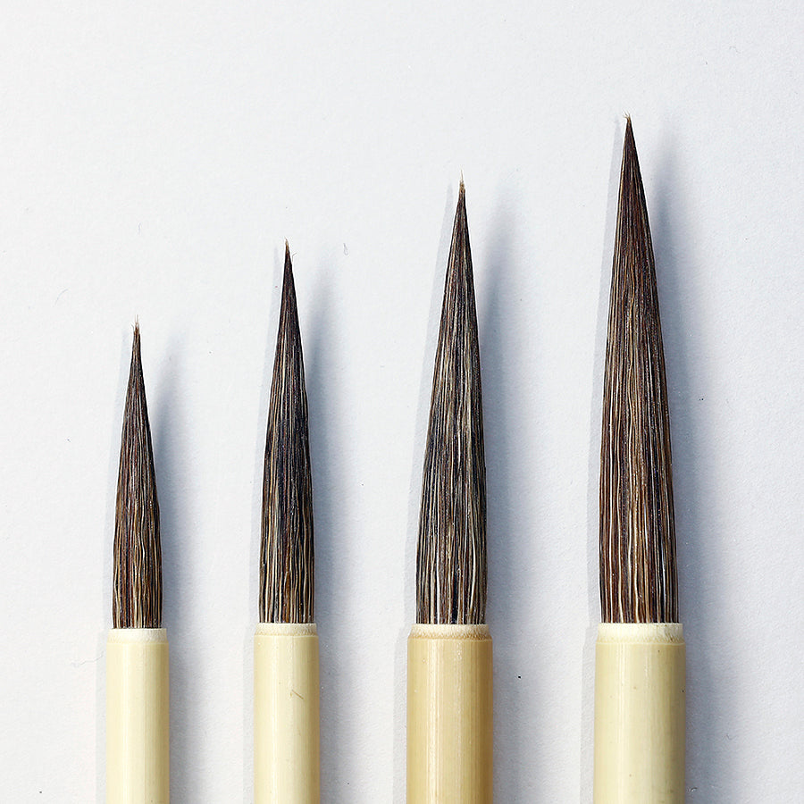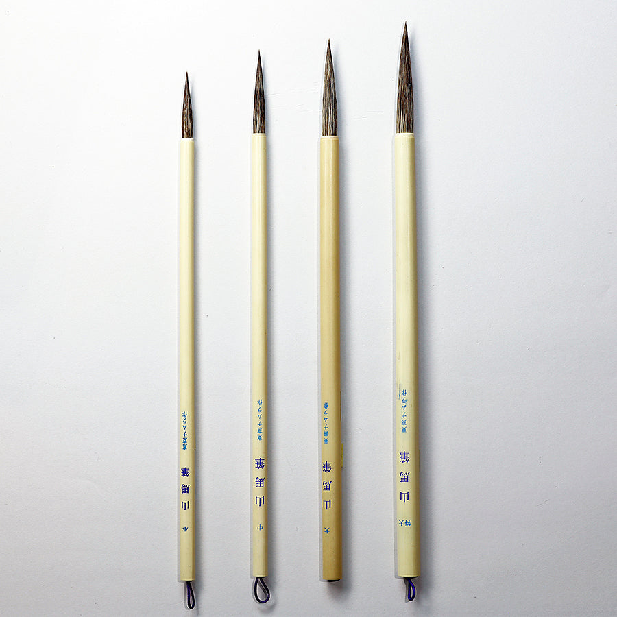 The touch is strong, and a rough blurriness unique to sanbar deer hairs and strong lines can be painted. This is suited for ink stick paintings expressing a rough feel using bamboo, branches, and stone surfaces. As the size gets larger the feel becomes more soft, and the tip is maneuverable.