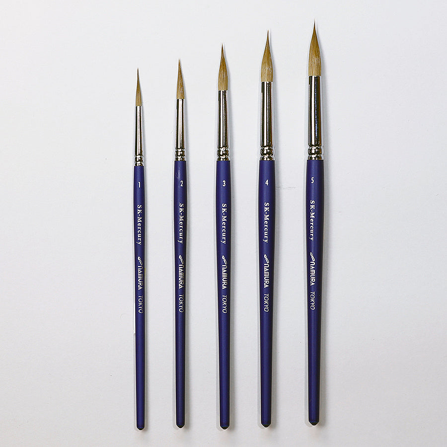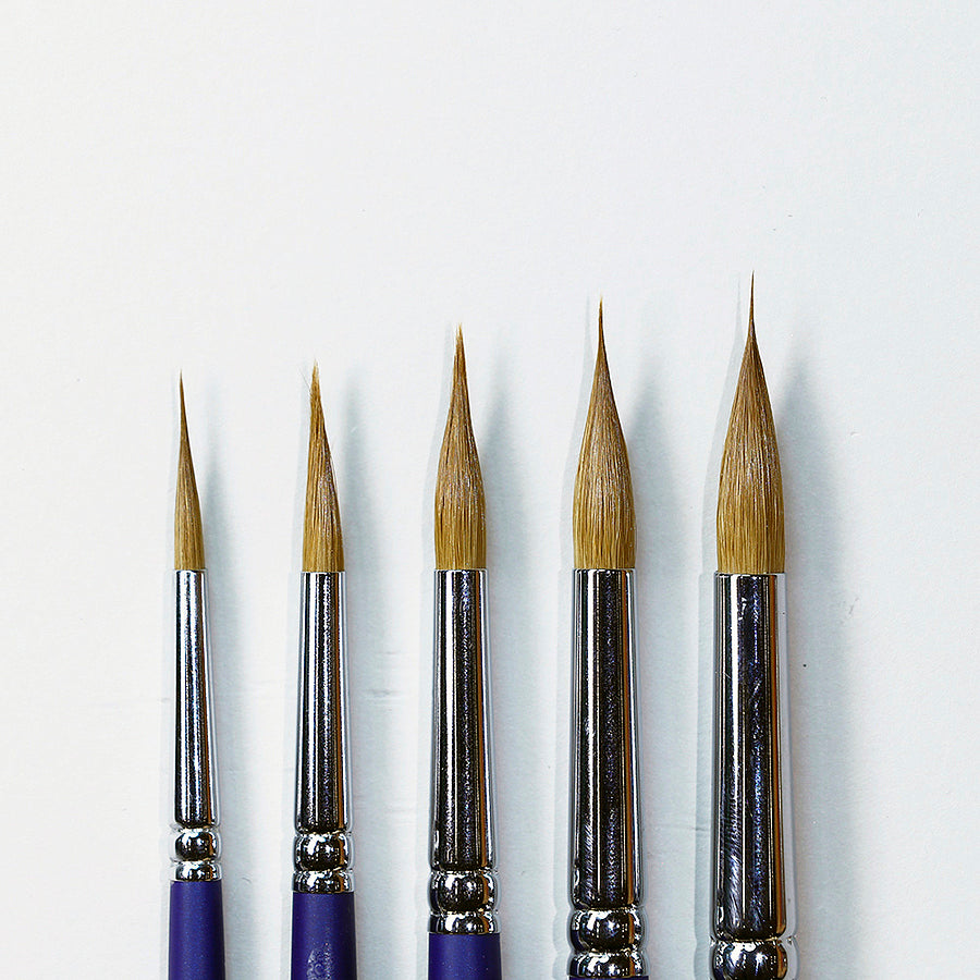 This is made from high quality kolinsky (Sable). The tip is flexible and settles well, and it has body. The tip is thin and the root is rather full. It absorbs the paint well, and thin and long lines can be painted using just the tip.