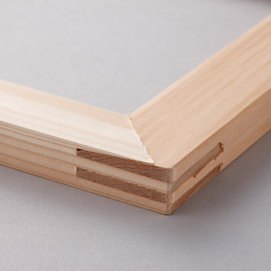 For the wood frame A, only wood from old growth forests more than 200 years old is used and carefully selected as a material so that the radial cutting is on the front surface, preventing warpage and curving. The material wood is Western red cedar (Cupressaceae) imported mainly from the northern West Coast of America or Canada. Unlike Japanese cedar, the wood surface is dark brown with narrow annual rings, and so straight material with stiffness and durability can be obtained since the wood has grown in a cold weather condition in the northern United States and Canada. This is strong and has excellent rigidity; therefore, it has the holding strength that does not lose to the strong pull of the large-type canvas. The canvas can be re-covered multiple times.