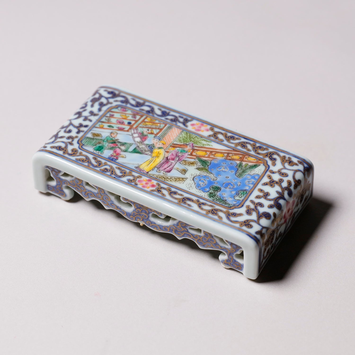 This ink rest can also be used as a brush rest. It is made of Chinese Jingdezhen porcelain and has a beautifully painted character design.