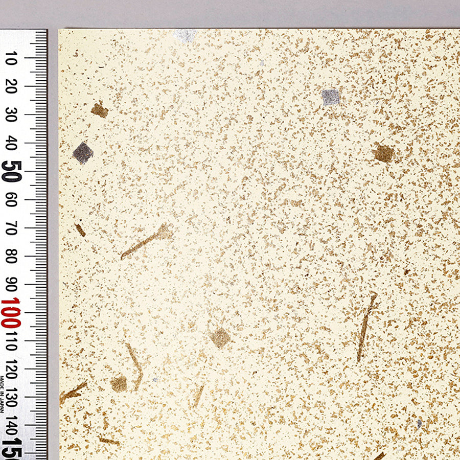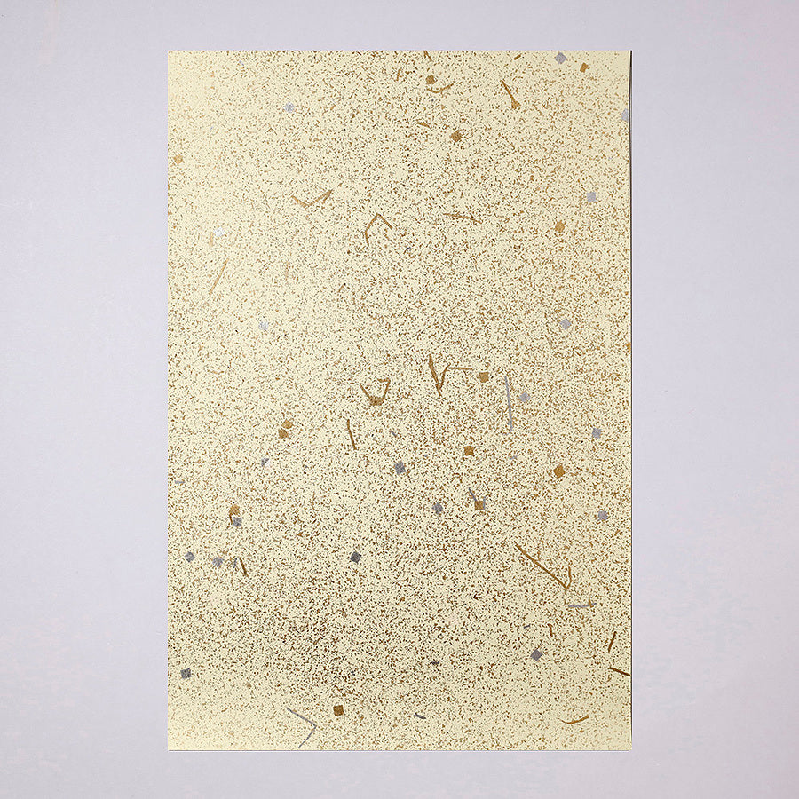 Brass Leaf (an alloy of copper and zinc) and aluminum leaf in the shapes of strings (noge) and tiny squares (koishi) are applied randomly on the torinoko paper.