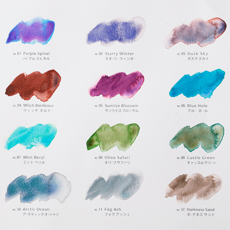 Purple Spinel, Starry Winter, Dusk Sky, Witch Bordeaux, Sunrise Blossom, Blue Hole, Mint Beryl, Olive Safari, Castle Green, Arctic Ocean, Fog Ash, Darkness Sand