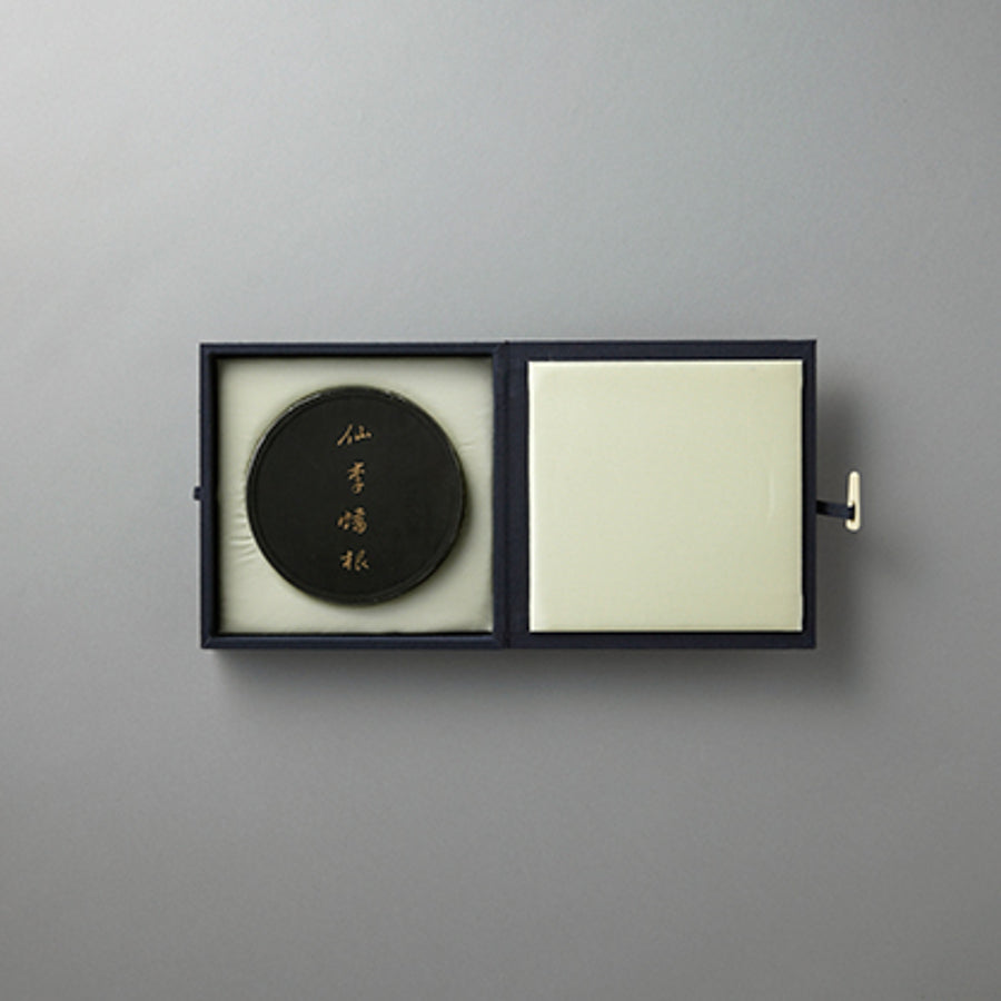 By putting the weight on the clarity with regard to clarity and muddiness overall, we added a three-dimensionality (separation of the core and bleeding) to a clear and bright feeling. We created a calm color. For the light ink stick, it is a refined red purple-type black with warmth where a slight blue can be felt. For the thick ink stick, it is an elegant black with sharpness and depth where a blue with absorbability can be felt. It can be used for hanging scrolls in kanji, kana, and ink stick paintings. Thick, medium, and light ink sticks can be used. As it gets older, we believe the ink stick calms in color, and its three-dimensionality, sharpness, personality, and features grow stronger. Manufactured in 1992