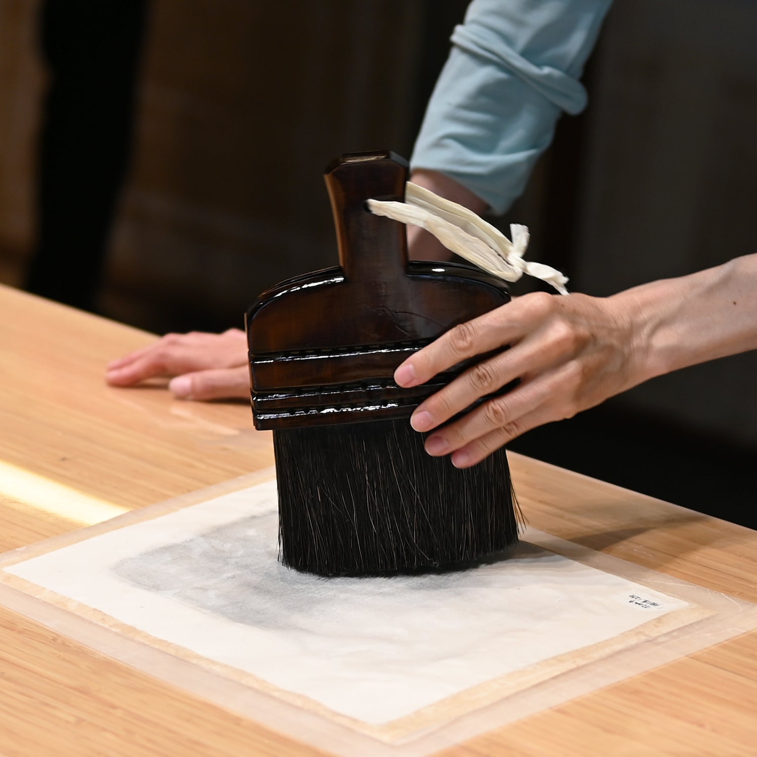良質なツグ毛、シュロ毛を使用しています。毛先で打ち、本紙や裂地と裏打ち紙とを十分に圧着し接着強度を高めたり、しなやかに仕上げる為に使用します。