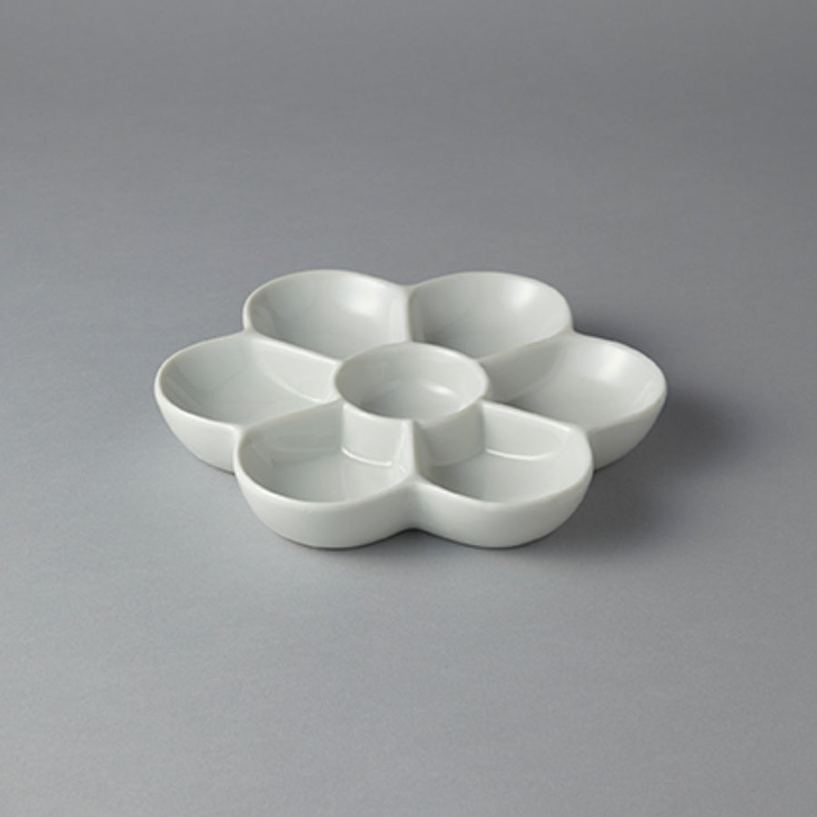 少量の水干や岩絵具を数色溶くときに便利な花形の絵皿です。顔彩や水彩の混色用パレットとしても役立ちます。陶器製