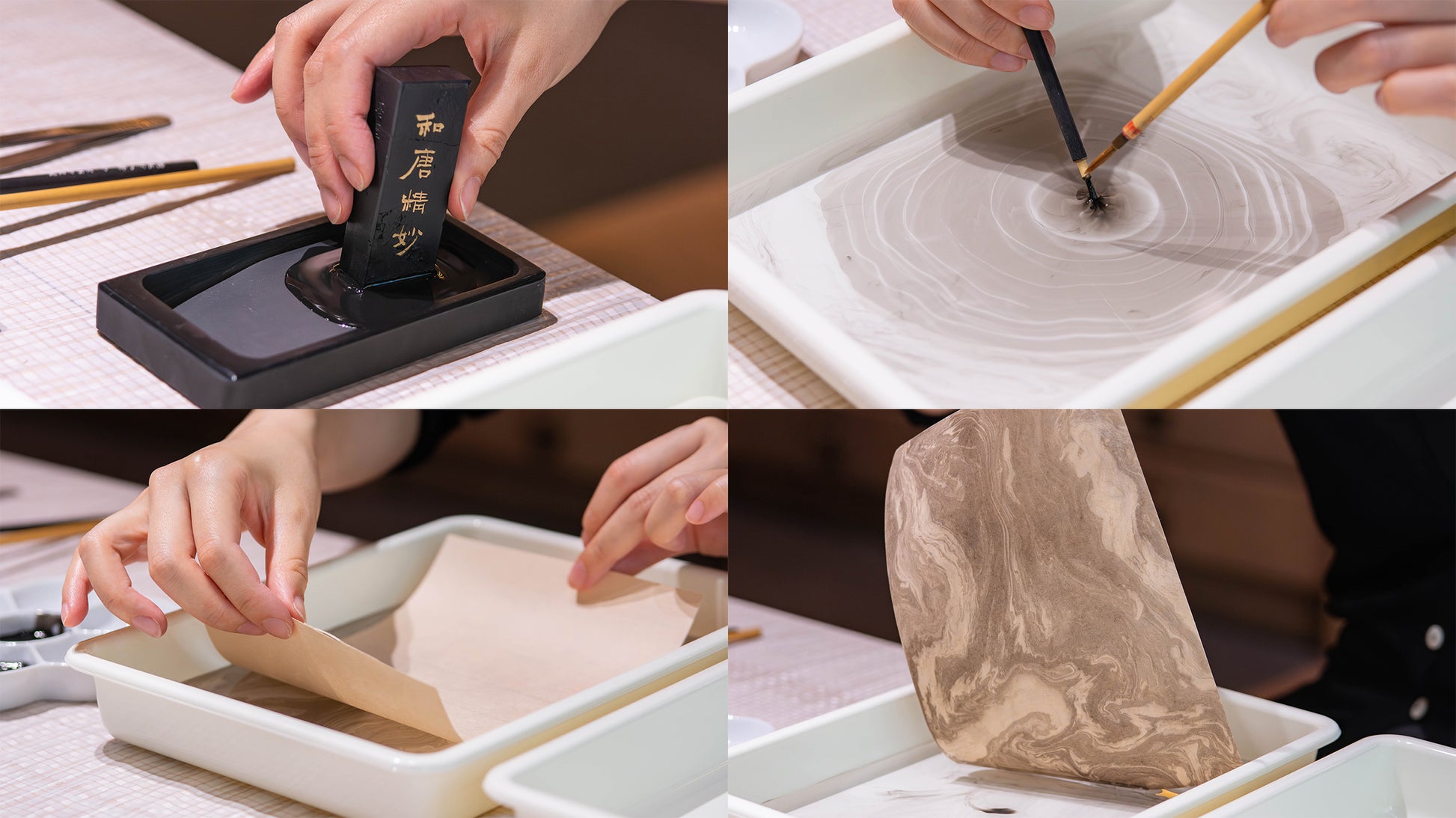 まずは静かに墨を擦り、墨と硯が擦れる音、墨に含まれる香料の薫りが立ち上るのを感じてください。水面に墨と精油を交互に垂らし、そっと息を吹きかけると、水の流れがそのまま模様となって現れます。刻一刻と変化する水の流れを観察し、その一瞬を和紙に写し取ります。