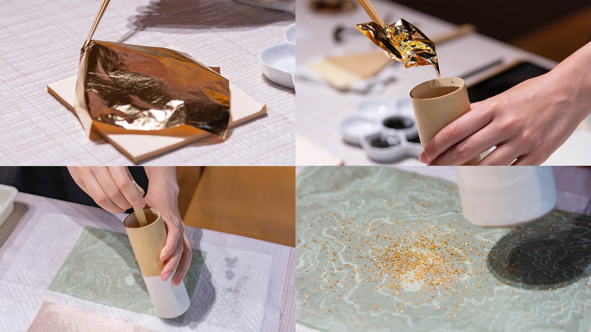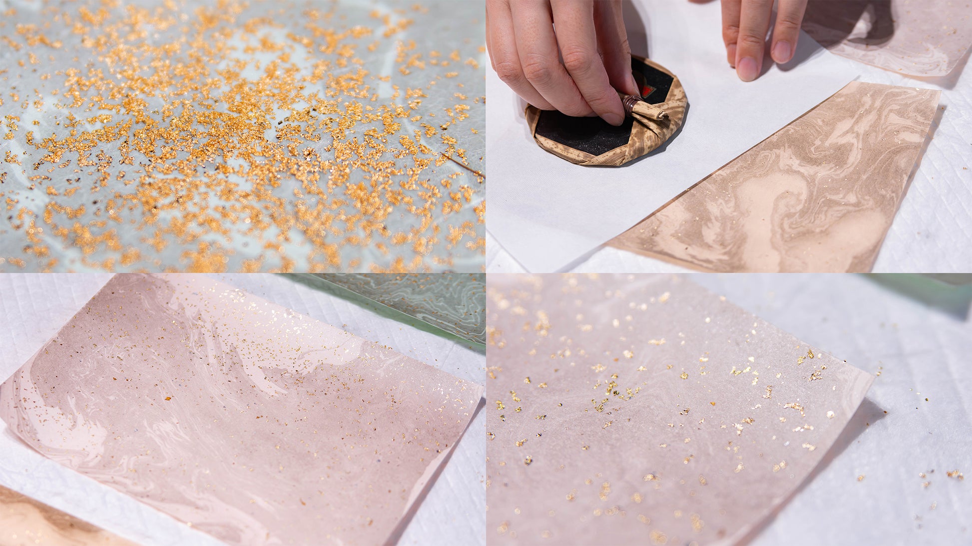 墨流しを施した和紙には、薄めた膠液(動物性の接着剤)を塗り、竹製の道具を使って金銀の砂子を散らしましょう。「砂子」は、童謡「たなばたさま」で天の川の輝きを現す言葉として歌われました。金属箔が放つ、絵具とは異なる光の効果は、見る角度や状況によって多彩な表情を見せ、作品に深みを与えます。