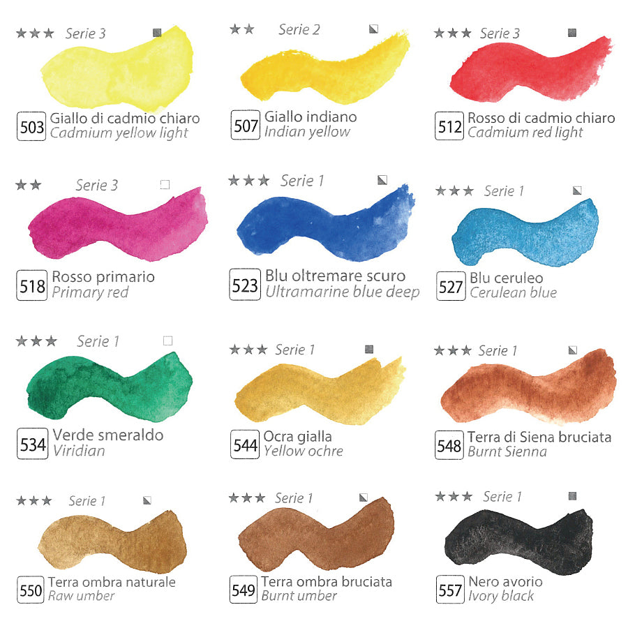 ヨーロッパの古典的製法で作られた水彩絵具です。現代の水彩絵具はアラビアゴムまたはデキストリン等の展色材にグリセリン等の人工の保湿材を使用して作られます。ヨーロッパの古典的製法ではアラビアゴムとハチミツを用いて作られます。ハチミツは保湿材の効果と防腐材の効果を兼ね備えた優秀な素材です。また、使用されている顔料も顔料成分が濃く、色鮮やかです。中にはDragon's blood等の古典的な顔料もいくつか使われているのも特徴です。