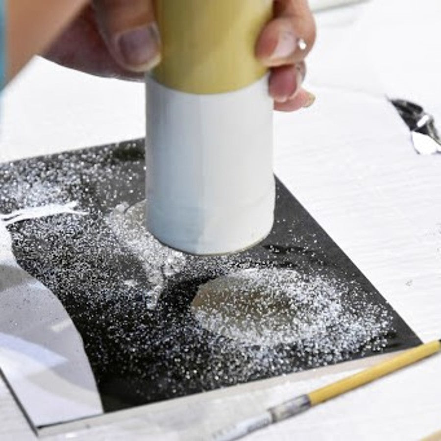 3. 膠液が乾かないうちに、箔を入れた砂子筒にスリ込刷毛を入れ軽くこするようにしてまきます。