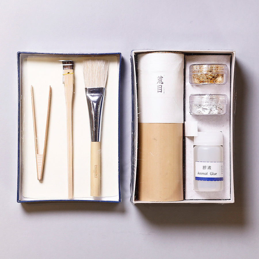 少量の箔と、砂子筒を1種類(荒さは選べません)と、道具が1箱に収まっています。
