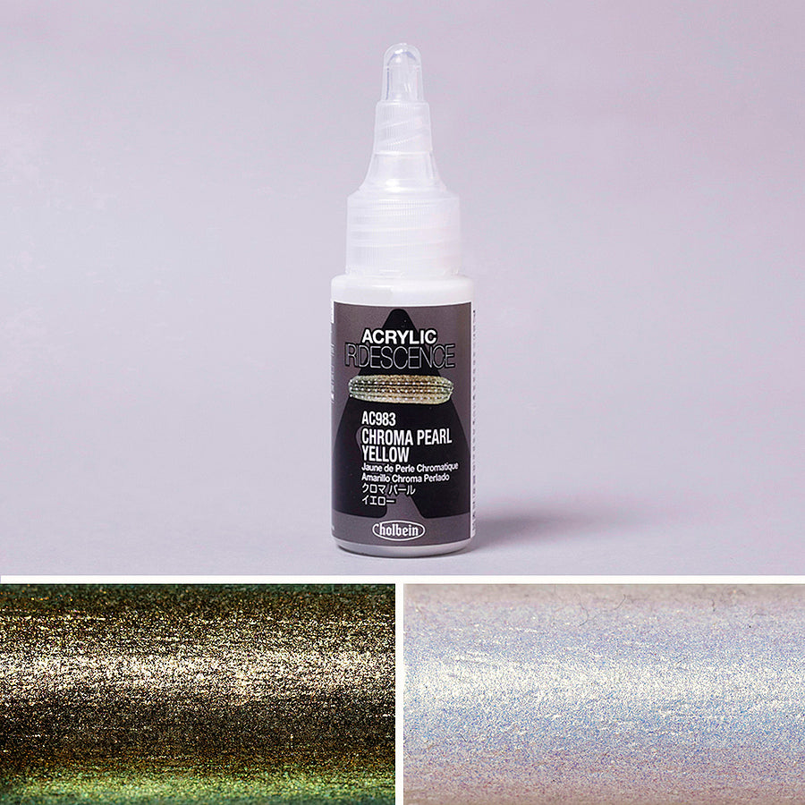 4色のクロマパール色は透明性が高く、下地の色を活かしながら、キラキラと色みが変わって見える効果を発揮します。他のホルベイン アクリリック シリーズと同様に、水で薄めることができ、乾くと耐水性の塗膜となります。