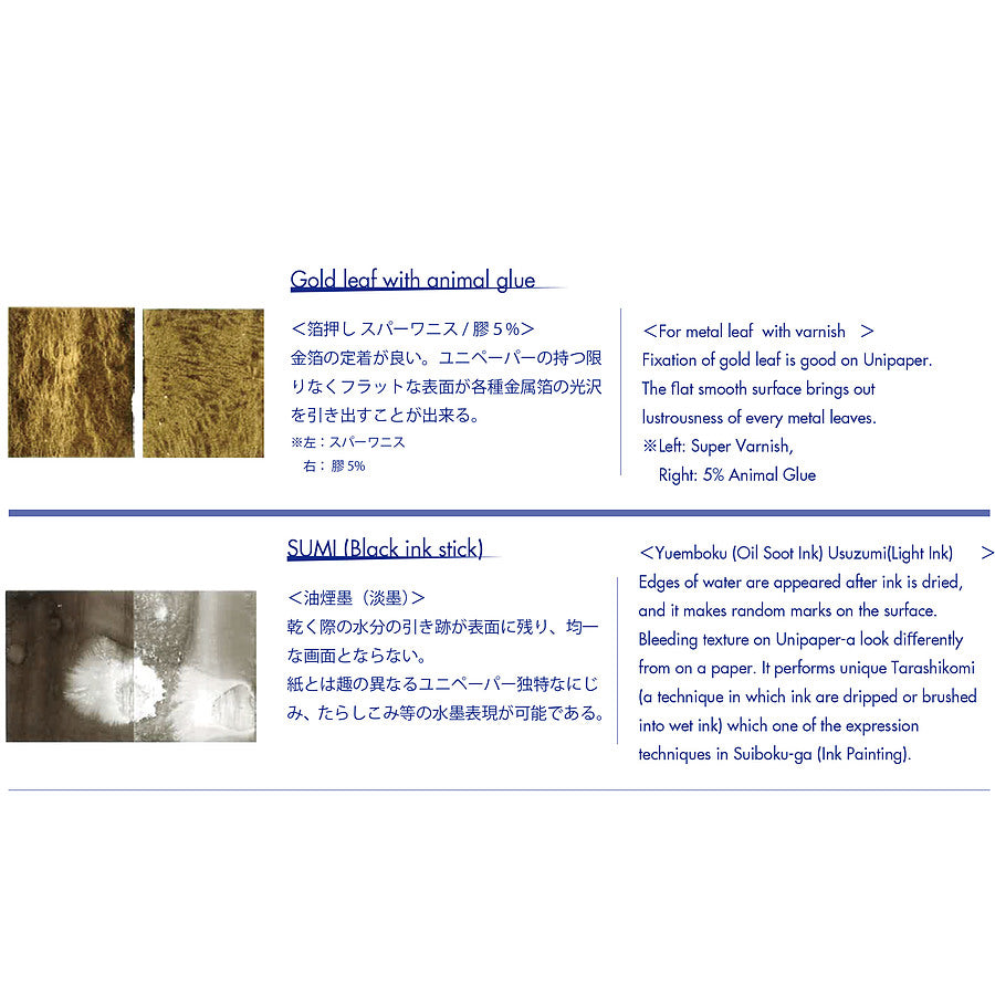 金箔の定着が良い。ユニペーパーの持つ限 りなくフラットな表面が各種金属箔の光沢 を引き出すことが出来る。