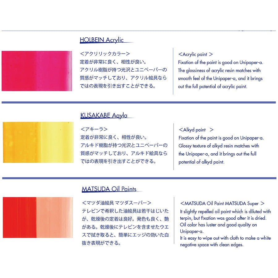 定着が非常に良く、相性が良い。 アルキド樹脂が持つ光沢とユニペーパーの 質感がマッチしており、アルキド絵具なら ではの表現を引き出すことができる。