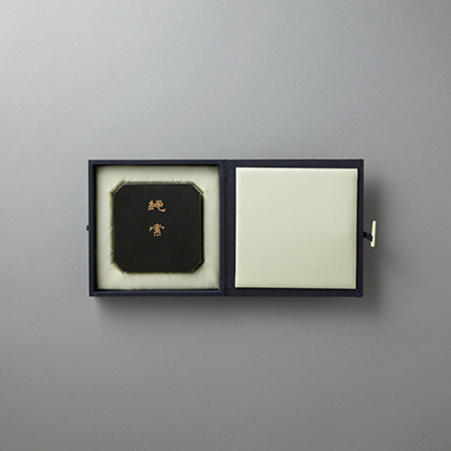 墨色の澄みと濁りの調和をやや濁りのほうに重きをおき、墨色の厚みとし、芯と滲みの調和をとり、全体として渋みのある上品な墨色にしてあります。淡墨の場合は、適度な立体感と温かみがあり、柔らかい感じに赤紫色を帯びた紫紺系の黒。濃墨の場合は、適度な濁りが墨色の厚み、強さとなり、吸収性の深みを感じる品の良い赤紫系の黒。漢字、少字数、仮名條幅に濃墨から超淡墨まで御使用頂けます。年を経るに従い墨も落ち着き墨色に強い立体感、冴えなど個性、特長がより一層顕著になると思います。製造年度;平成七年
