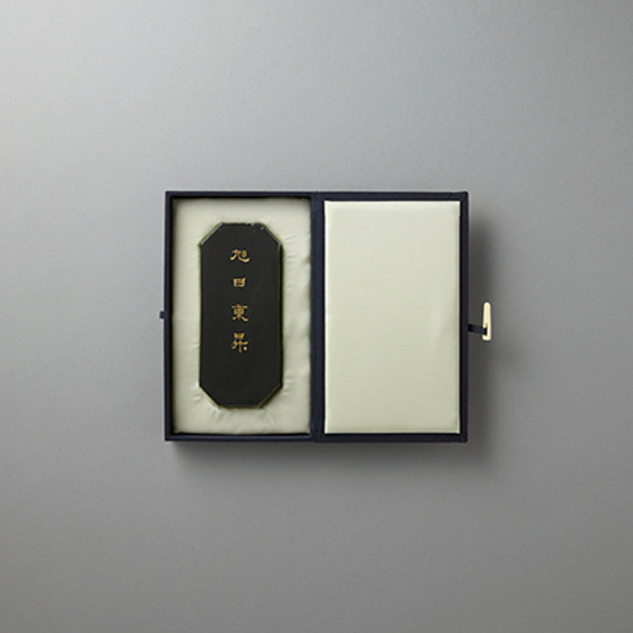 体質的には炭素粒子の分散を抑えられるだけ抑え、地味な感じの中に暗さ、強さを調和させ、その上に赤みと白光で温かみと品位を具備させ、はんなりとした青墨にしてあります。色彩的には地味な青みの中にやや暗さと不透明さを持たせ、赤みを帯びた紫紺系の厚みのある複雑な青墨。年を経るに従い墨も成長し個性、特長が現れてくることと思いますが、今後どのように変化して古墨色を表現するか楽しみであります。この旭日東昇は書画ともにご使用頂けます。製造年度:平成元年