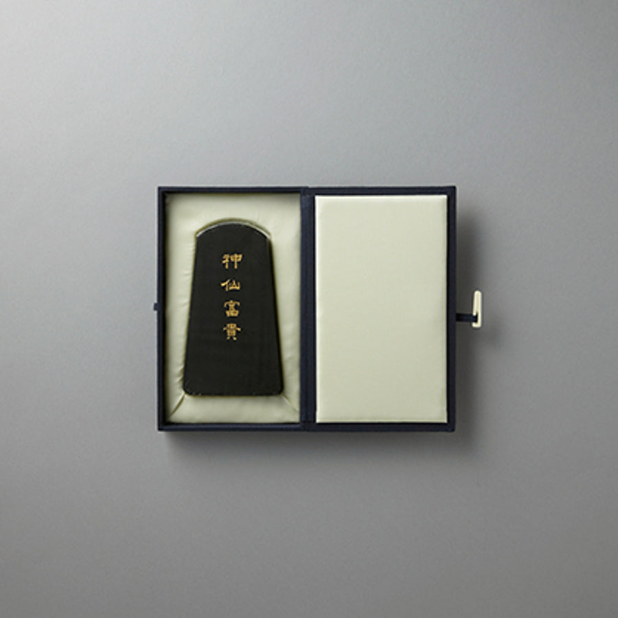 体質的には炭素粒子の分散をより抑え、全体的に地味な感じの中に、墨色の強さ、明るさを調和させ、赤みと白光で品位を具備させてあります。色彩的には全体的に地味な青みの中に強い紫紺色を持たせ、やや赤みを帯びた不透明さが墨色の厚みと強さになり、紫紺系の地味ながら温かさのあるおとなしい青墨。年を経るに従い一応墨も落ち着き芯と滲みの分離、墨色の冴えが出てまいります。尚又年と共に墨が乾き個性特長がより一層顕著になると思います。この神仙富貴は書画ともに御使用頂けます。製造年度:平成元年