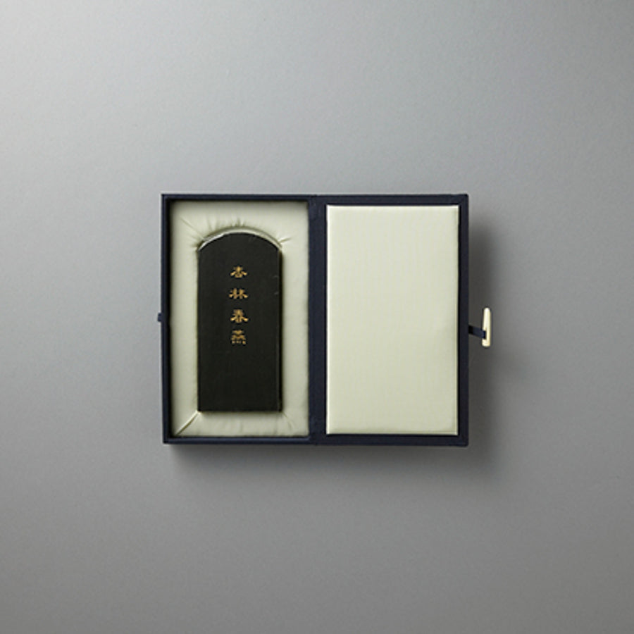 体質的には炭素粒子の分散を抑え、地味な感じの中に明るさ、強さを調和させ、赤みと白光で温かみと品位を具備させてあります。色彩的には地味な青みの中にやや明るさを持たせ、赤みを帯びた紫紺系の不透明で厚みのある力強い複雑な青墨。年を経るに従い墨も成長し個性、特長が顕著に現れてくると思います。この杏林春燕はここ二、三年来新しく開発し、造りかけた製品で今後どのように変化し、古墨色を表現するのか楽しみにしております。製造年度:昭和63年