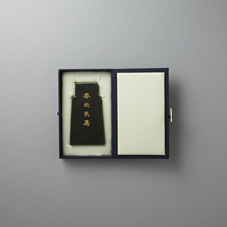 体質的には炭素粒子の分散を抑え、派手な感じの中に暗さ、強さを調和させ、赤みと白光で温かみと品位を具備させてあります。色彩的には派手な青みの中にやや暗さを持たせ、赤みを帯びた紫紺系の不透明で厚みのある強く複雑な青墨。年を経るに従って墨も成長し、個性、特長が顕著に現れてくると思います。この春光長壽はここ二、三年来新しく開発し、造りかけた製品で今後どのように変化し、古墨色を表現するのか楽しみにしております。製造年度:昭和63年