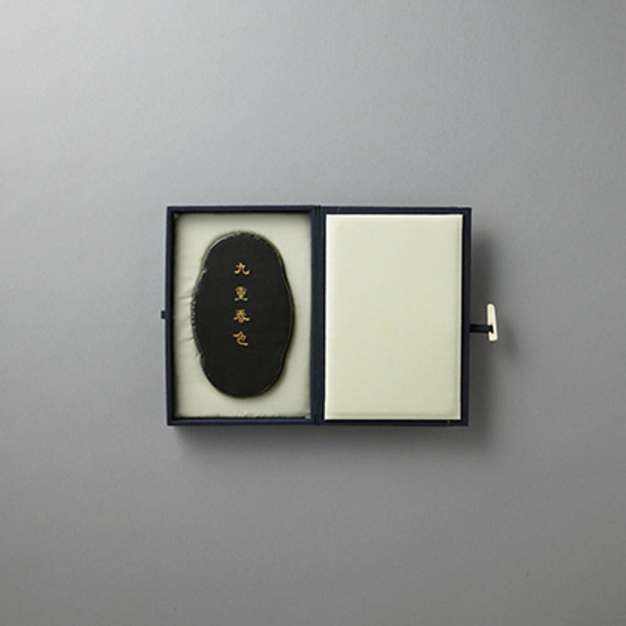 体質的には炭素粒子の分散を抑え、全体的に地味な感じの中に明るさを調和させ、赤み(温かみ)と白光(品位)を具備させてあります。色彩的には全体的に地味な青みの中に赤みを帯びた不透明さが、墨色の厚みと強さになり、地味ながら温かみのある明るくおとなしい味のある青墨。年を経るに従い墨も成長し個性、特長が顕著に現れてくることと思います。製造年度:昭和62年
