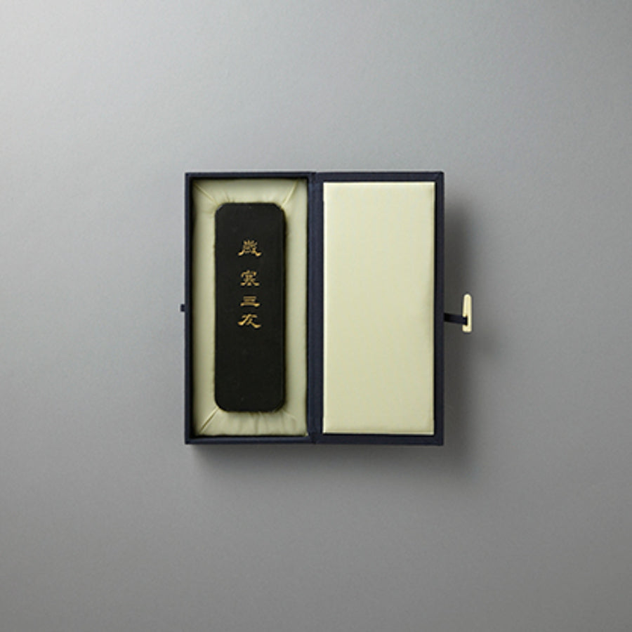 体質的には炭素粒子の分散を十分に伸びをよくし、明るい(派手さ)美しさの中にやや暗さ(地味)をもたせ、派手と地味を調和させ、赤み(温かみ)と白光(品位)を具備させてあります。色彩的には赤みを帯びた不透明さが墨色の深さ、強さになり、芯と滲みの調和をとり、やや暗さを感じる中に明るくおとなしい、美しい青墨。この墨は今までの墨と異なり、特長を発揮するまで製造後四、五年以上掛かると思います。以後年を経るに従い個性、特長を発揮することと思います。製造年度:昭和61年