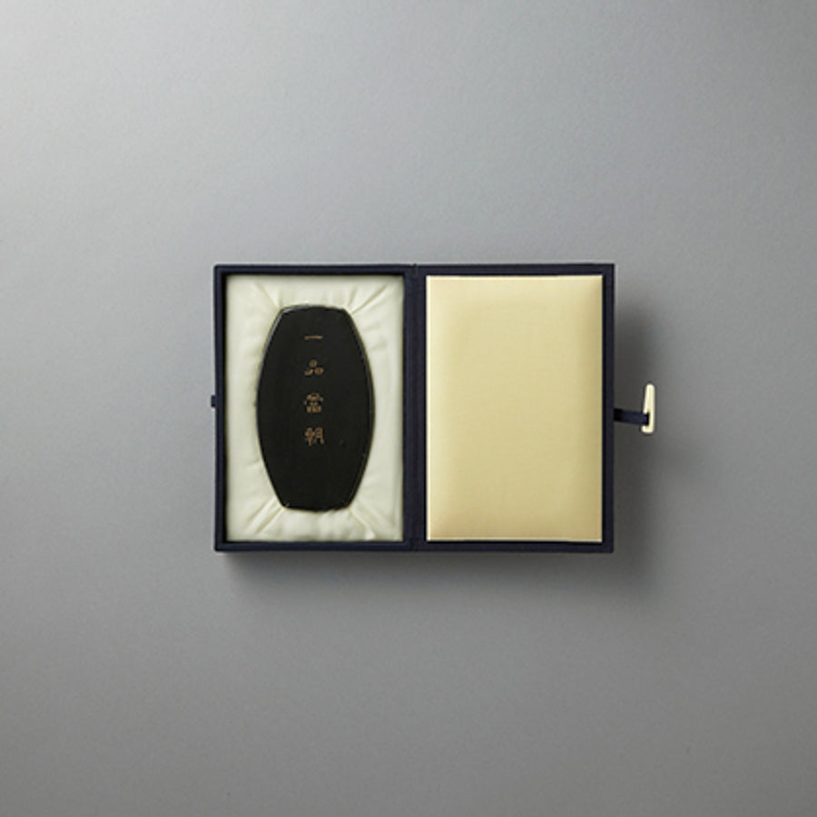 体質的には炭素粒子の分散を最大限に抑えるよう膠を調整し、地味な色彩と墨色に厚みのでるように造ってあります。色彩的には赤茶紫系の中でも最も粒子の細かい炭素を使用しておりますので、淡墨にした場合は白光(品位)を帯びた黒の中に薄赤茶紫色のかかった上品な墨色。濃墨の場合は赤紫系で厚みがあり、温かみ、深みのある特異な黒です。漢字、少字数、近代詩文、仮名条幅(加工紙)水墨画など濃、中、淡墨どの濃度でも御使用頂けます。年を経るに従い個性、特長が出てくることと思います。製造年度:昭和61年