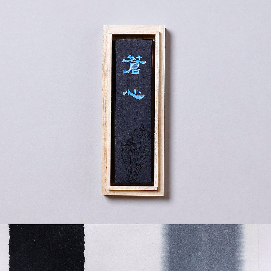 青みの強さを主体におき、本藍と顔料を加えた墨です。墨色は墨運堂製品の中で一番青みが強く明るく澄んだ青墨です。塗り重ねができ光らず、濃淡が自在に表現でき、奥行きが深く、墨色の距離感がある立体的な画に向きます。