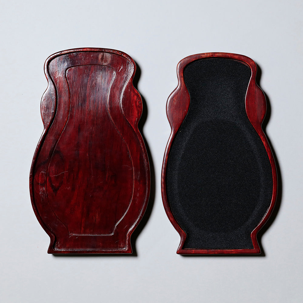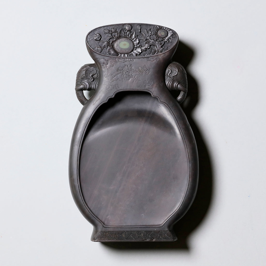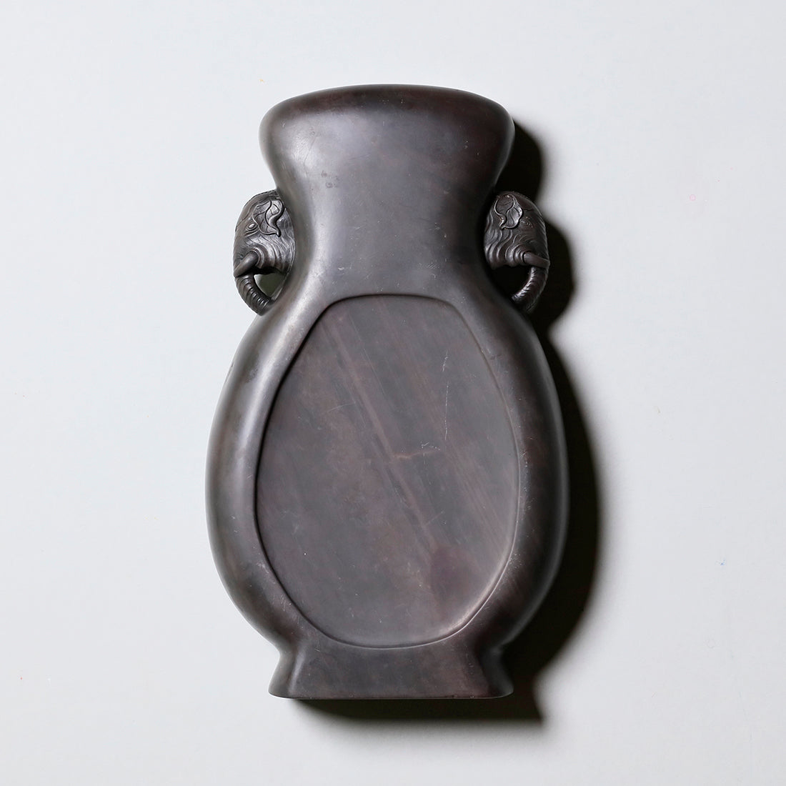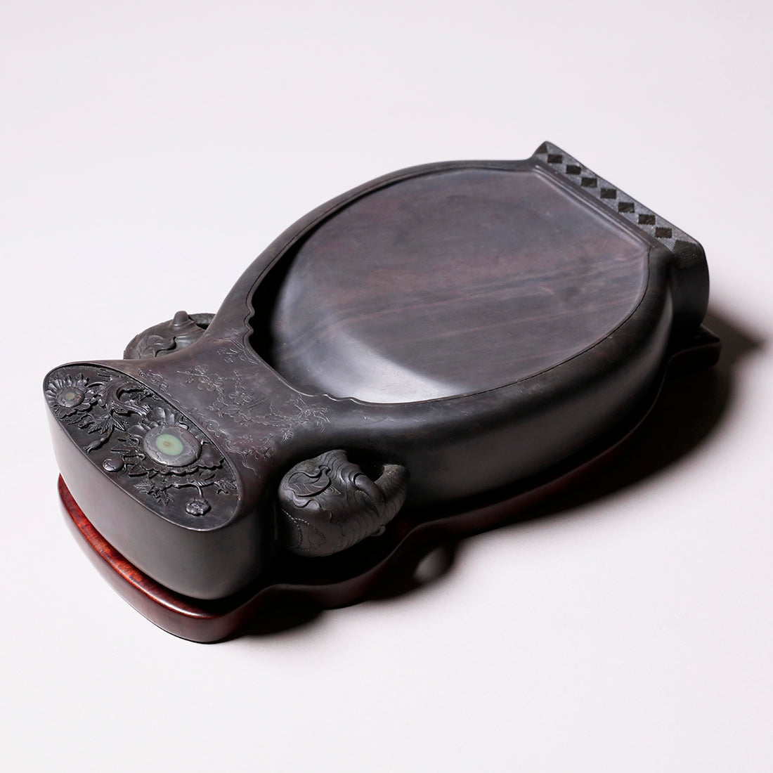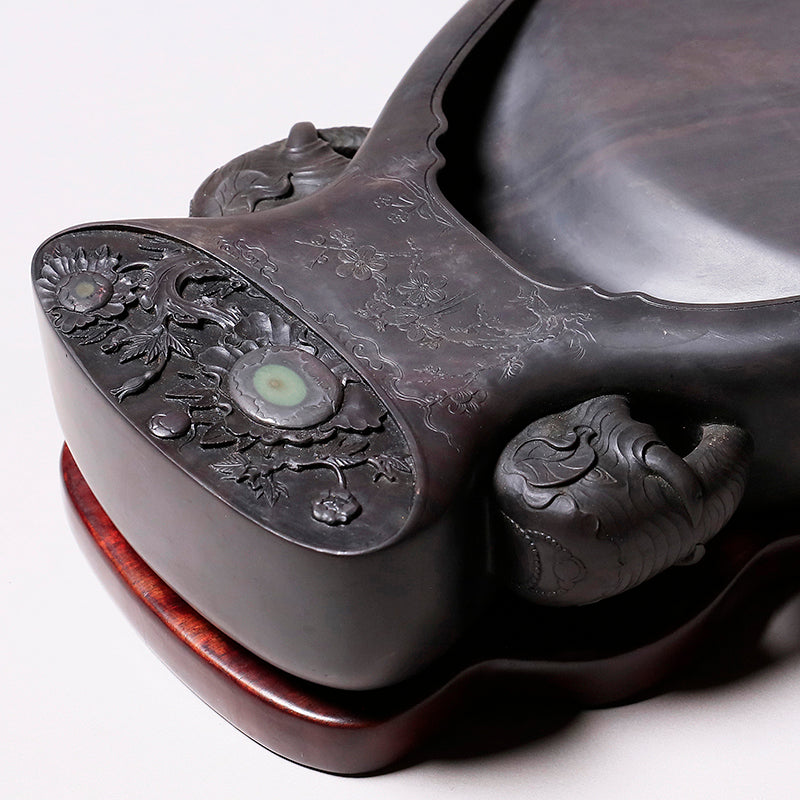 端渓硯は中国の硯における代名詞的な存在です。石のモース硬度は3.5と比較的柔らかく、その柔らかさ故に彫りを施しやすいため、装飾的な物が多くあります。また種類が豊富で採掘される抗窟で石質、名称が異なります。最上のものは川の水が流れ込む「老坑」と呼ばれる抗窟から採取したのもので、その肌合いはきめ細かく非常に滑らかです。それ故に墨を非常に滑らかに磨り下ろせ、水持ちが良く、磨った墨が乾きにくいのが特長です。それ故に油煙墨との相性がよいです。また、硯面に現れる石紋が幅広く豊かで、その紋一つ一つに名称が付けられているほどです。