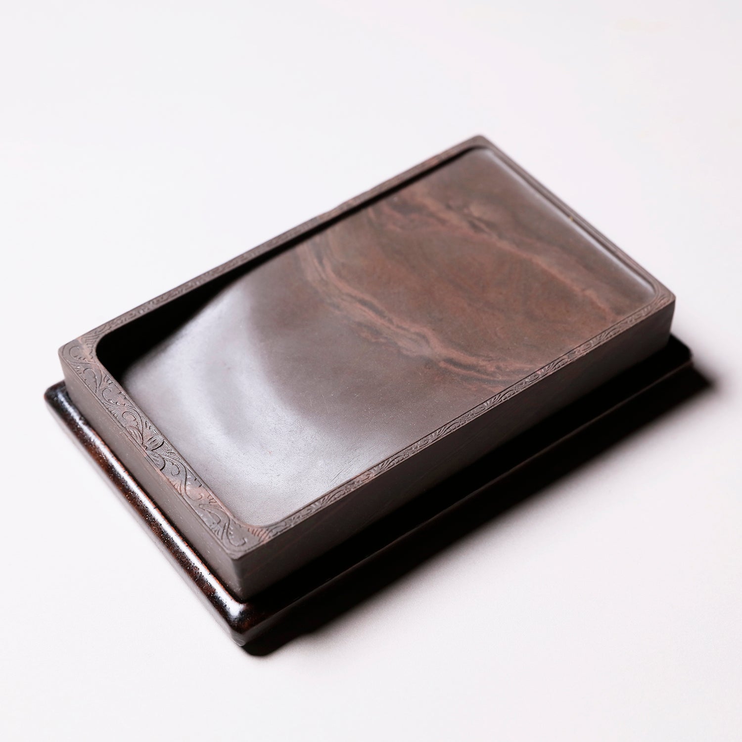 中国の硯における代名詞的な存在です。石のモース硬度は3.5と比較的柔らかく、その柔らかさ故に彫りを施しやすいため、装飾的な物が多くあります。また種類が豊富で採掘される抗窟で石質、名称が異なります。最上のものは川の水が流れ込む「老坑」と呼ばれる抗窟から採取したのもので、その肌合いはきめ細かく非常に滑らかです。それ故に墨を非常に滑らかに磨り下ろせ、水持ちが良く、磨った墨が乾きにくいのが特長です。それ故に油煙墨との相性がよいです。また、硯面に現れる石紋が幅広く豊かで、その紋一つ一つに名称が付けられているほどです。