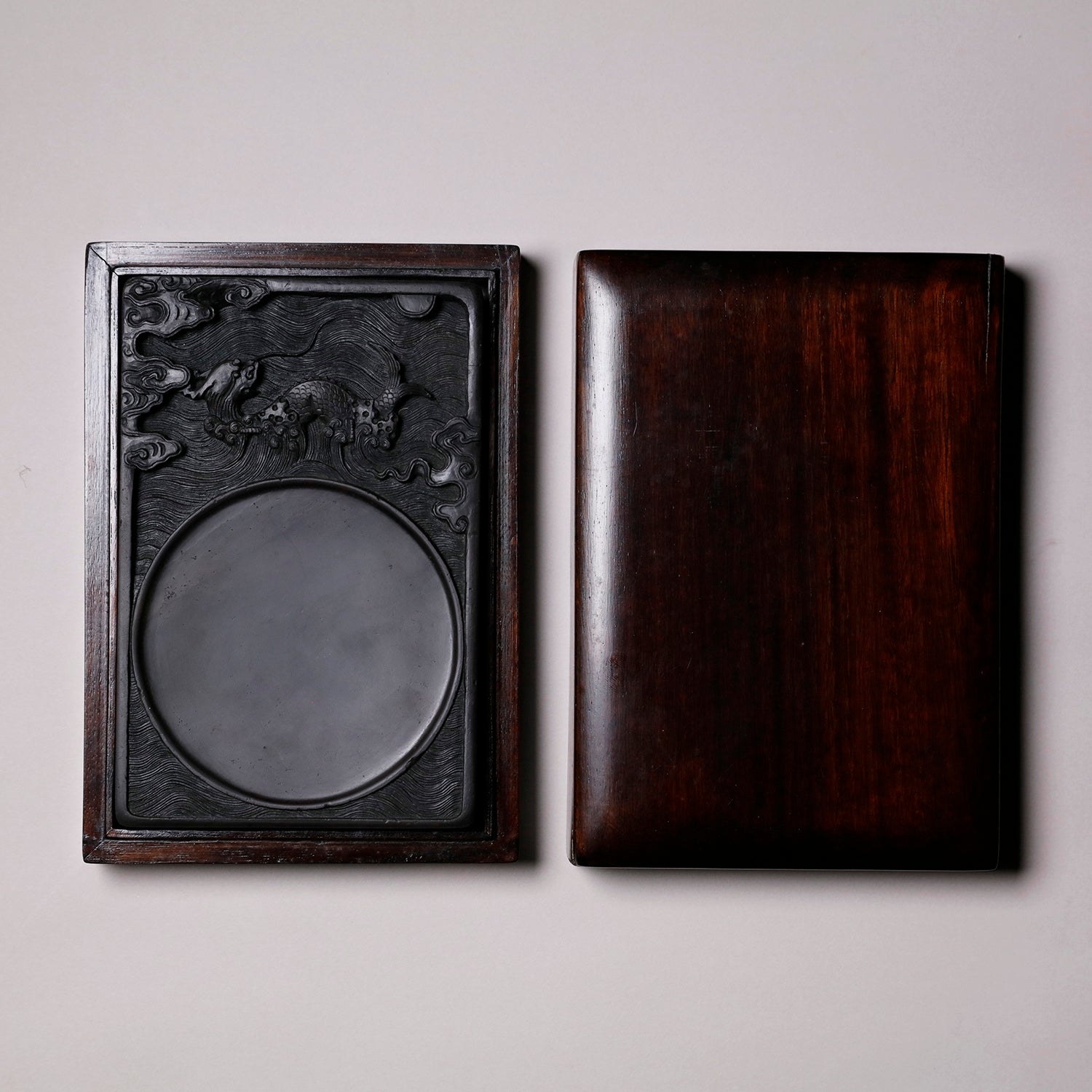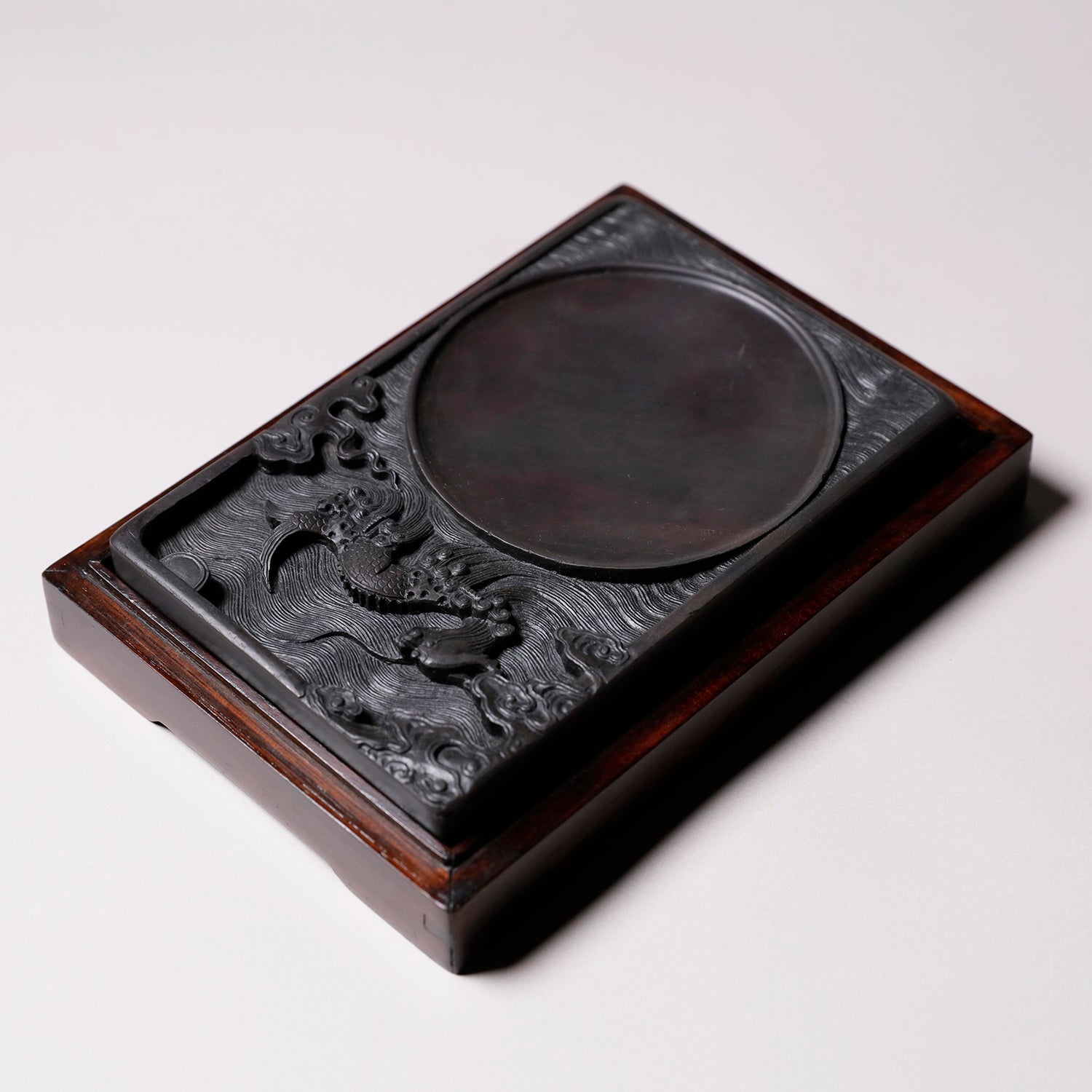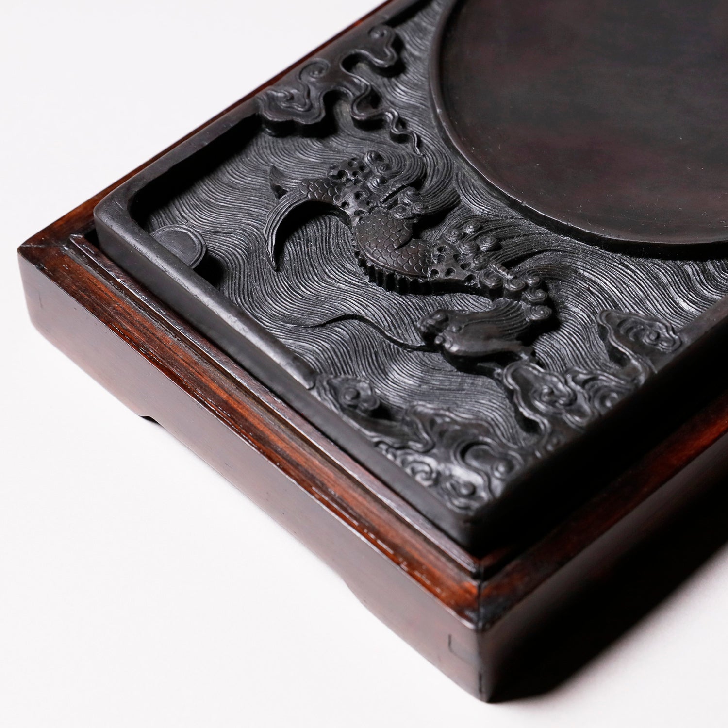 端渓硯は中国の硯における代名詞的な存在です。石のモース硬度は3.5と比較的柔らかく、その柔らかさ故に彫りを施しやすいため、装飾的な物が多くあります。また種類が豊富で採掘される抗窟で石質、名称が異なります。最上のものは川の水が流れ込む「老坑」と呼ばれる抗窟から採取したのもので、その肌合いはきめ細かく非常に滑らかです。それ故に墨を非常に滑らかに磨り下ろせ、水持ちが良く、磨った墨が乾きにくいのが特長です。それ故に油煙墨との相性がよいです。また、硯面に現れる石紋が幅広く豊かで、その紋一つ一つに名称が付けられているほどです。