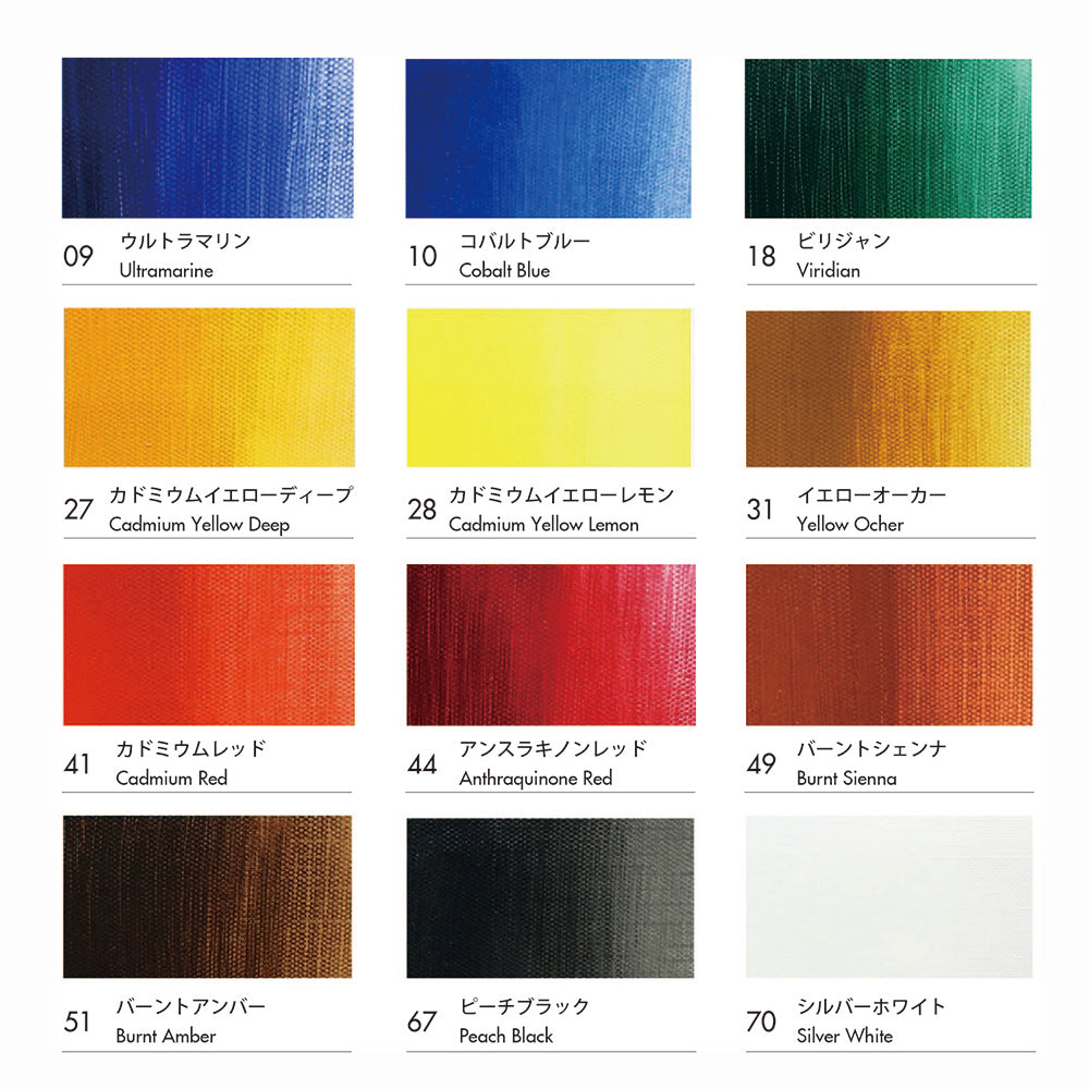 09 ウルトラマリン、10 コバルトブルー、18 ビリジャン、27 カドミウムイエローディープ、28 カドミウムイエロー レモン、31 イエローオーカー、41 カドミウムレッド、44 アンスラキノンレッド、49 バーントシェンナ、51 バーントアンバー、67 ピーチブラック、70 シルバーホワイト