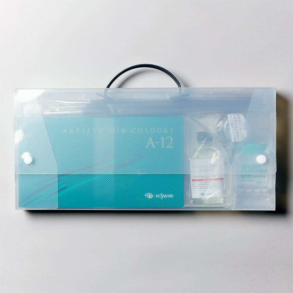 ストライプクリアボックス(PP製)、ペーパーパレット(ハーフ)、A-12(専門家用油絵具6号12色)、ペインティングオイルスペシャル55ml、ペインティングナイフNo.2、パレットナイフ、油つぼ(鉄)、ブラッシクリーナー100ml、豚毛筆AR6号・10号、豚毛筆A4号・8号・12号・14号