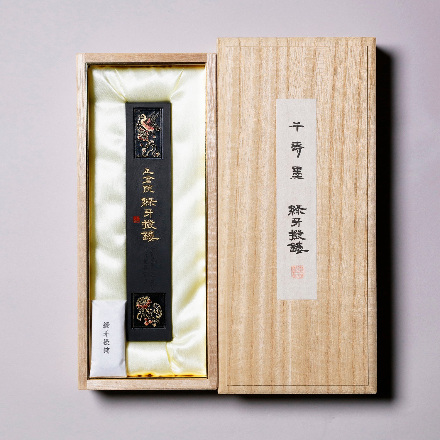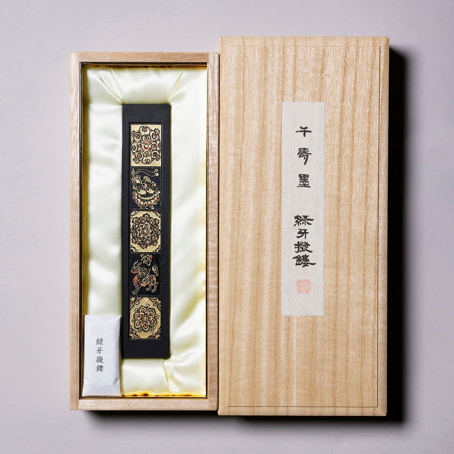 呉竹千寿墨は、中国から造墨の技が伝えられて一千数百年という悠久の歴史を背景に、呉竹が今日の粋を記録に留めたいという願いを込めて練り上げた墨匠畢生の作です。
