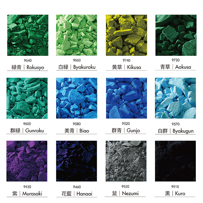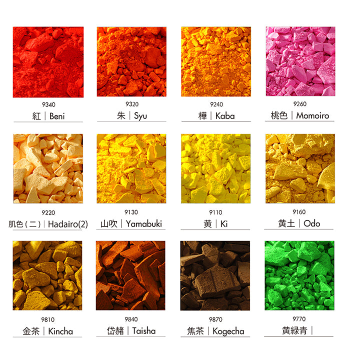 紅、朱、樺、桃色、肌色(二)、山吹、黄、黄土、金茶、岱赭、焦茶、黄緑青、緑青、白緑、黄草、青草、群緑、美青、群青、白群、紫、花藍、鼠、黒