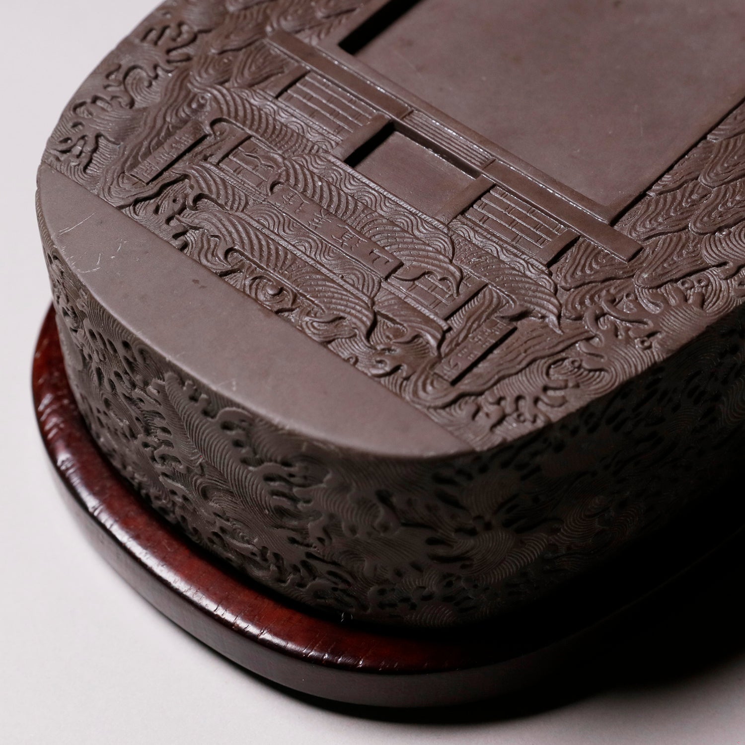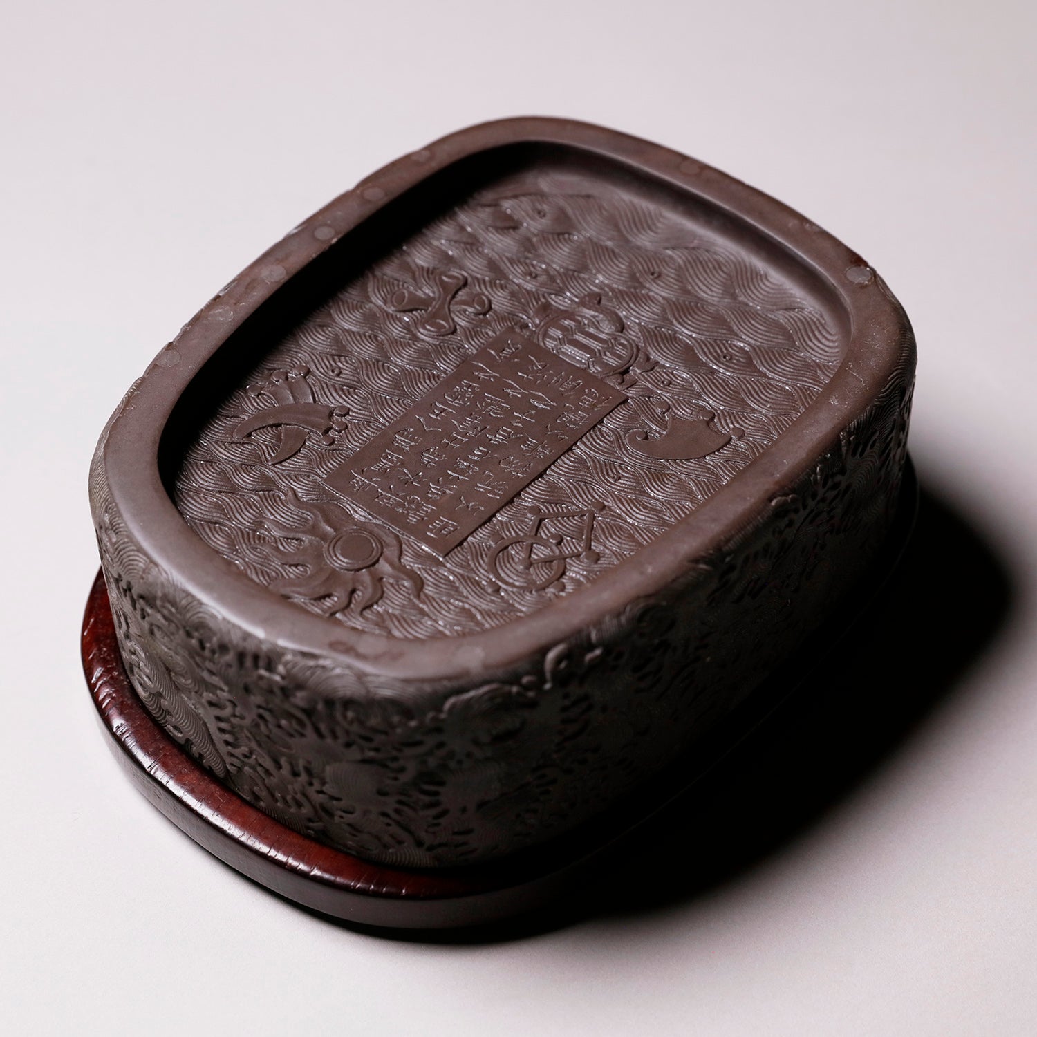 中国の硯における代名詞的な存在です。石のモース硬度は3.5と比較的柔らかく、その柔らかさ故に彫りを施しやすいため、装飾的な物が多くあります。また種類が豊富で採掘される抗窟で石質、名称が異なります。最上のものは川の水が流れ込む「老坑」と呼ばれる抗窟から採取したのもので、その肌合いはきめ細かく非常に滑らかです。それ故に墨を非常に滑らかに磨り下ろせ、水持ちが良く、磨った墨が乾きにくいのが特長です。それ故に油煙墨との相性がよいです。また、硯面に現れる石紋が幅広く豊かで、その紋一つ一つに名称が付けられているほどです。